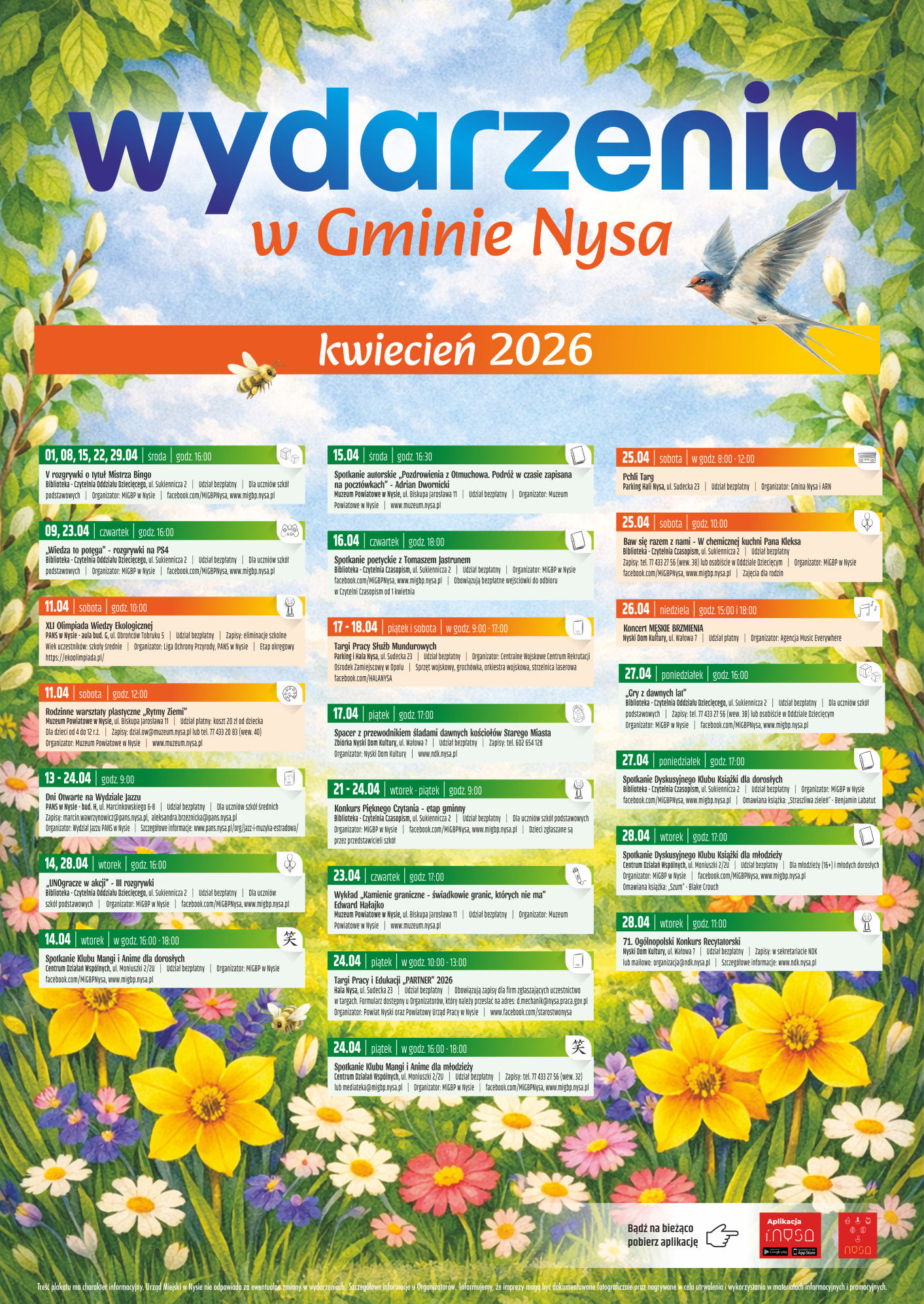 Kwiecień 2026 w Gminie Nysa to miesiąc pełen atrakcji dla mieszkańców i turystów. W programie znalazły się wydarzenia kulturalne, edukacyjne, rozrywkowe oraz targi pracy. Jeśli szukasz informacji co robić w Nysie w kwietniu 2026, poniżej znajdziesz kompletny harmonogram wraz z godzinami, miejscami i organizatorami – bez potrzeby dalszego szukania.